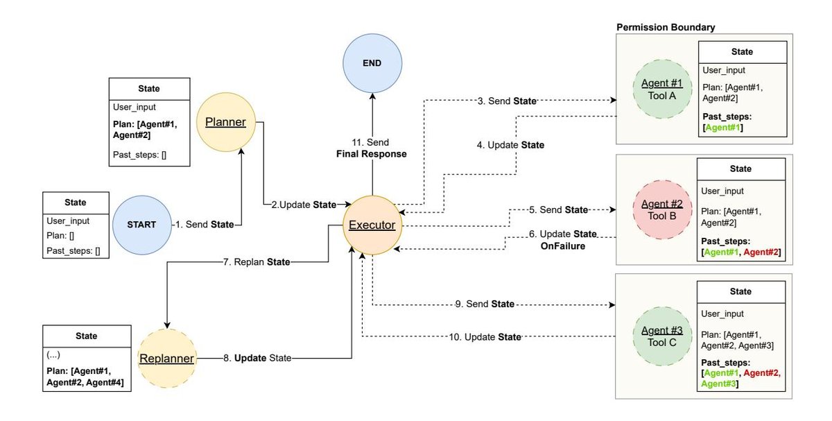 - Security Practice: The example code shows how to implement the principle of least privilege: the planner specifies the required tool for each step in the plan, and the executor node dynamically creates a temporary agent for each step that is equipped with only that single tool.