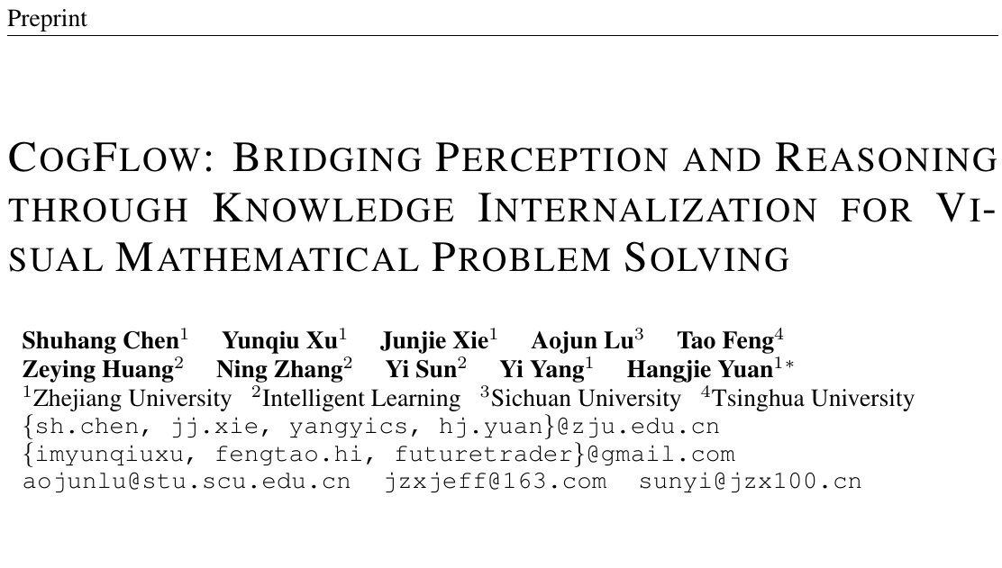 To address this pain point, a research team from Sichuan University, Tsinghua University, and Zhejiang University proposed a new human-cognition-inspired framework—CogFlow. For the first time, this framework explicitly simulates the hierarchical thought flow of human cognition: “perception $\Rightarrow$ internalization $\Rightarrow$ reasoning.” By introducing a unique “knowledge internalization” stage, it successfully bridges the gap between visual perception and logical reasoning. On authoritative benchmarks such as MathVerse and MathVista, CogFlow with only 7B parameters has shown the potential to surpass closed-source giants like GPT-4V.